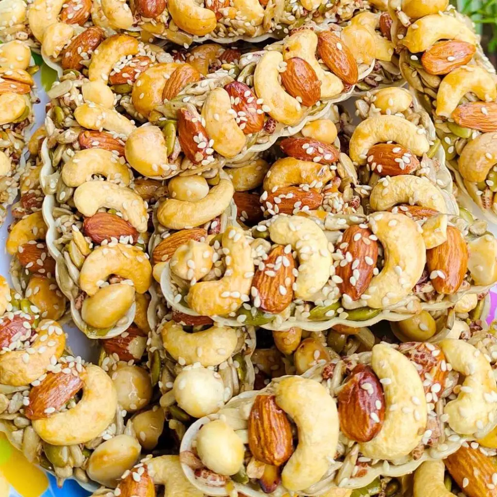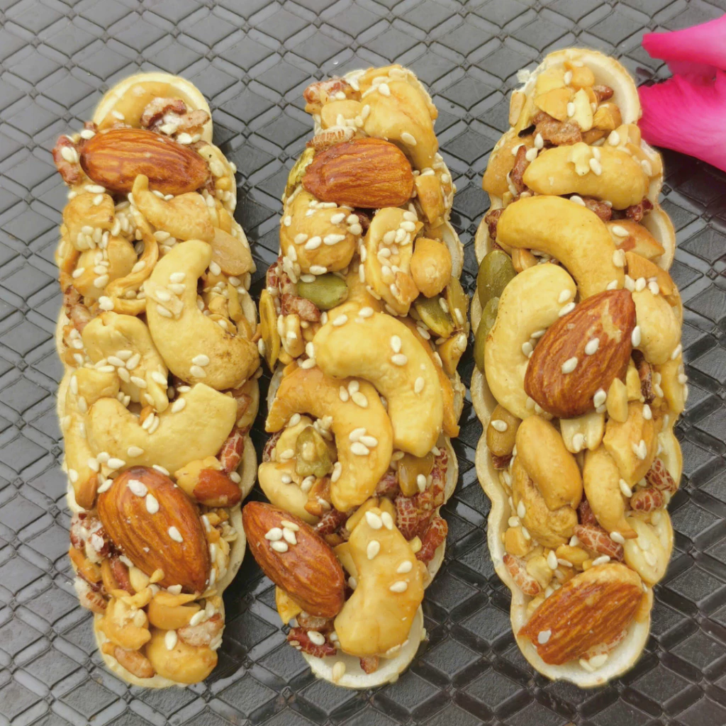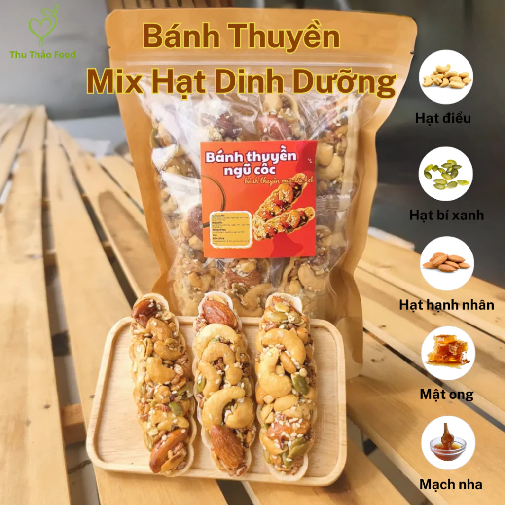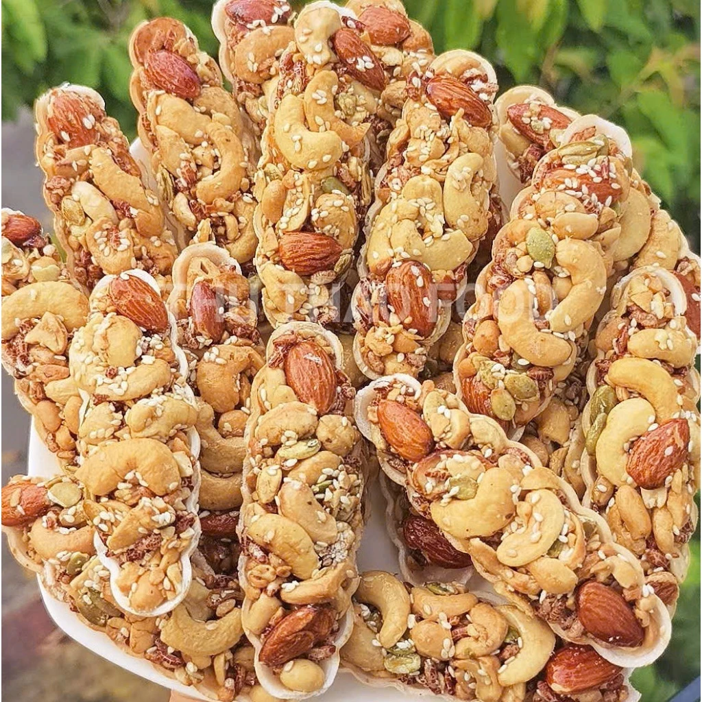 – Thành phần: Hạt hạnh nhân, hạt macca hạt điều, hạt bí xanh, mè trắng, mạch nha, mật ong