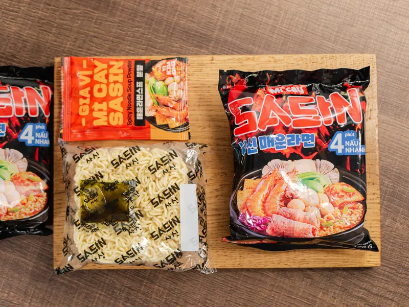 Gói mì gồm có: 1 Vắt mì Sasin, 1 gói gia vị Mì Cay Sasin Đặc Biệt – vị Kimchi, 1 gói dầu.