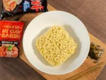 + Bước 2: cho vắt mì, gói dầu, và topping (tùy thích) vào